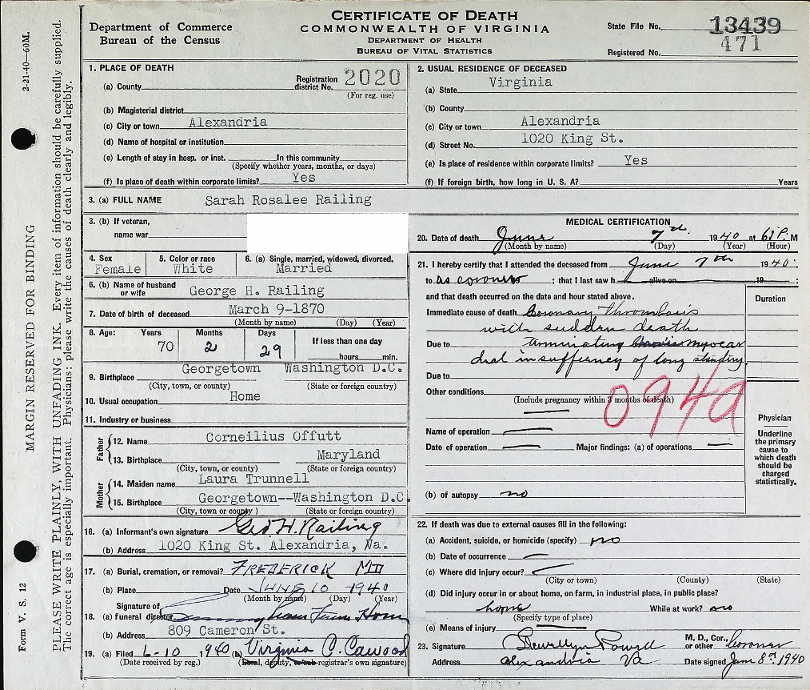 State of Virginia Death Certificate for Sarah Rosalee Railing (nee Offutt)