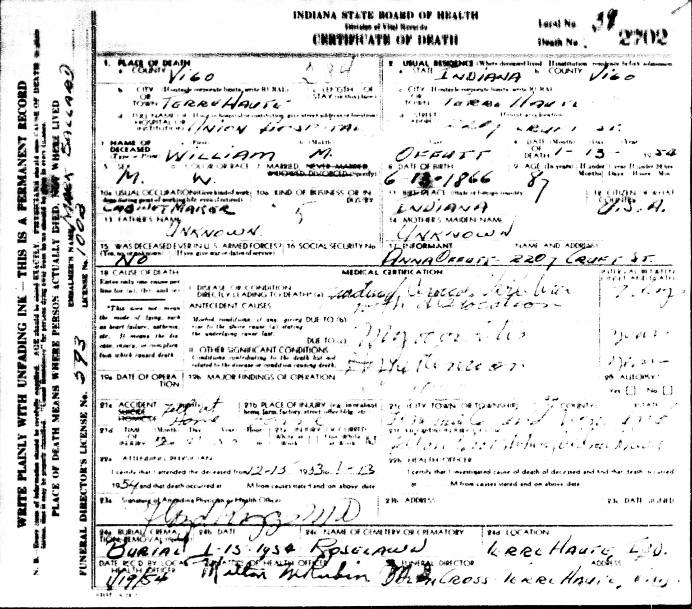 Indiana Death Certificate for William M. Offutt
