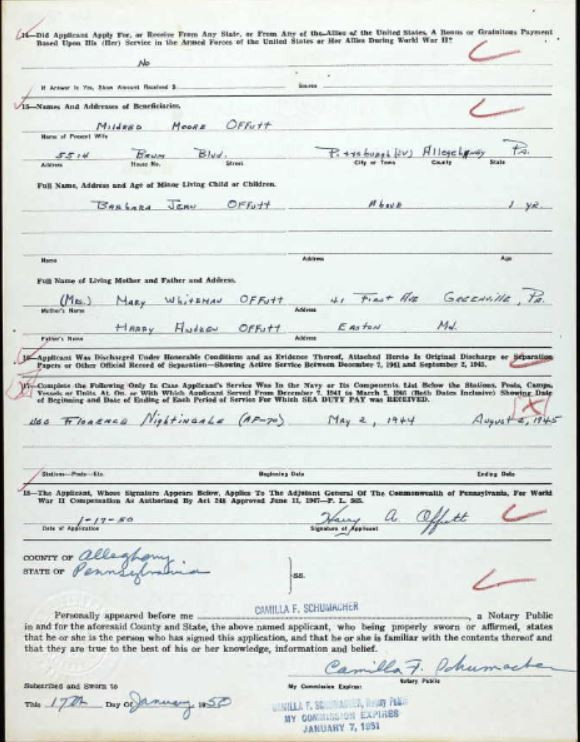 Application for PA Veterans Compensation for Harry Andrew Offutt, back of app
