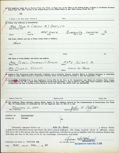 Application for PA Veterans Compensation for John H. Offutt, back of app