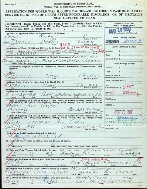 Application for PA Veterans Compensation for John Thomas Offutt, submitted by his ex-wife for their son