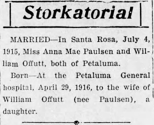 Marriage of William J. Offutt and Anna Mae Paulsen, and birth of their daughter