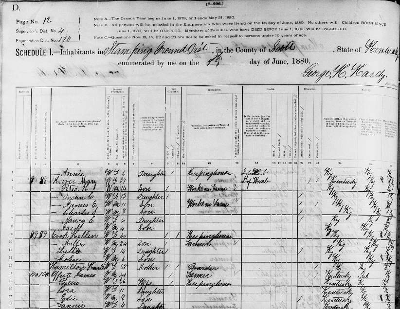 1880 Federal Census; Stamping Ground District, Scott County, Kentucky. Household of James Offutt