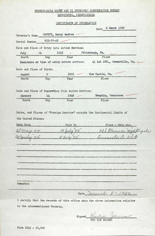 PA Veterans Compensation Certificate of Information for Harry Andrew Offutt