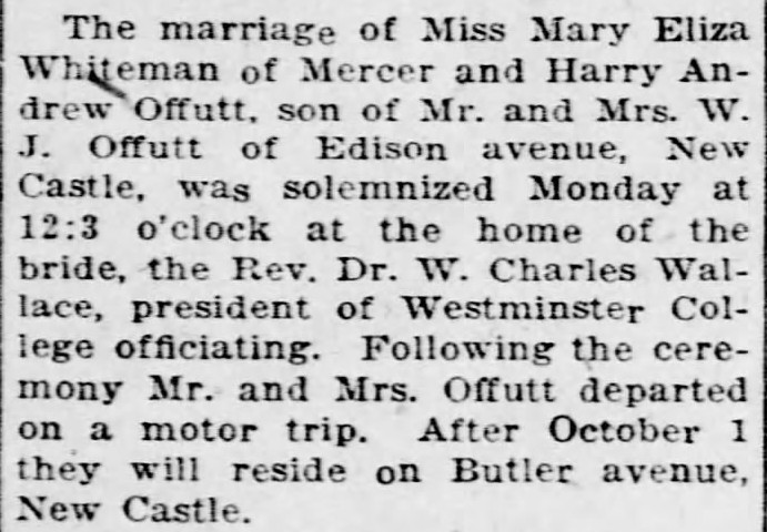 Announcement of marriage between Harry A. Offutt and Mary Eliza Whiteman