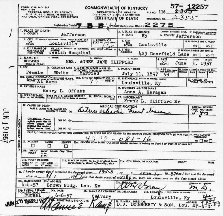 Death Certificate for Mrs. Agnes Jane Clifford