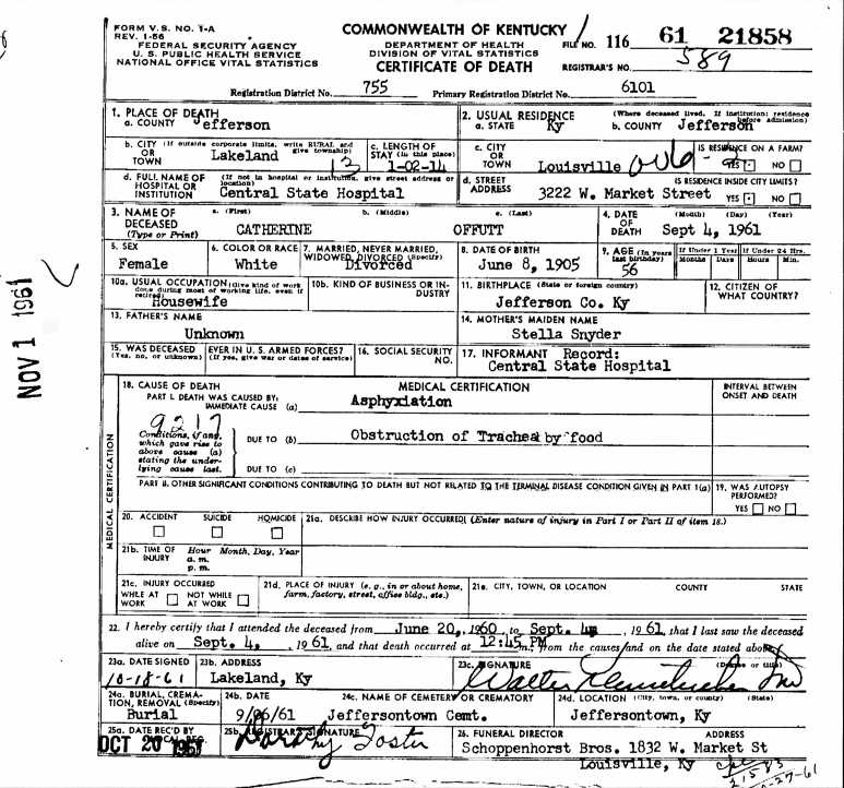Death Certificate for Catherine Offutt