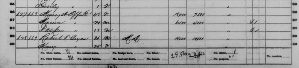 1860 Federal Census of Ward 1, Lexington, Fayette County, KY. Household of Robert T. Bryan