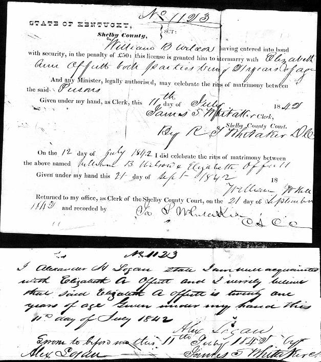 Shelby County Kentucky Marriage Register, Marriage #1123. Marriage of William B. WIlson and Elizabeth Ann Offutt, married July 12, 1842 by William W. Hill (I think I've interpeted the signature correctly)