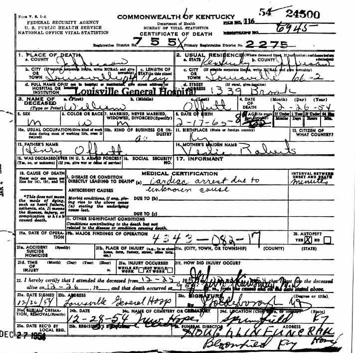 Death Certificate for William Offutt