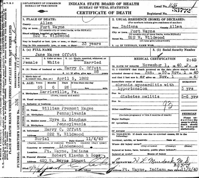Death Certificate for Jane Magee Offutt