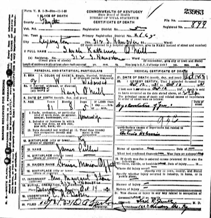 Kentucky Death Certificate for Sarah Katherine O'Neill