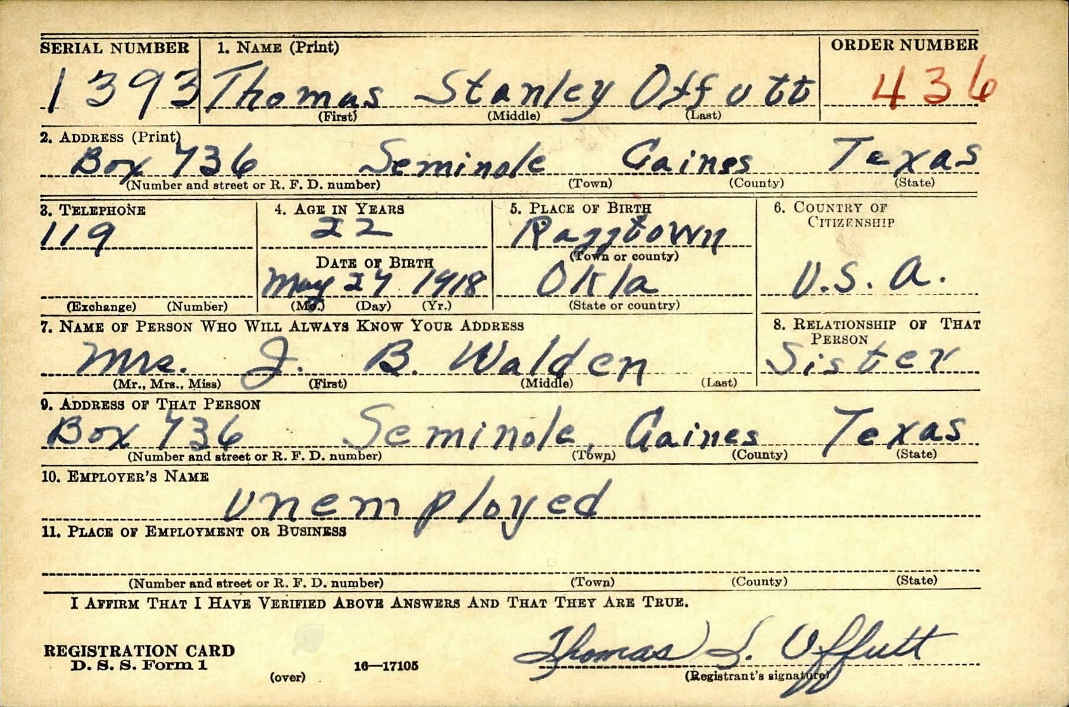 Draft Registration card for Thomas Stanley Offutt