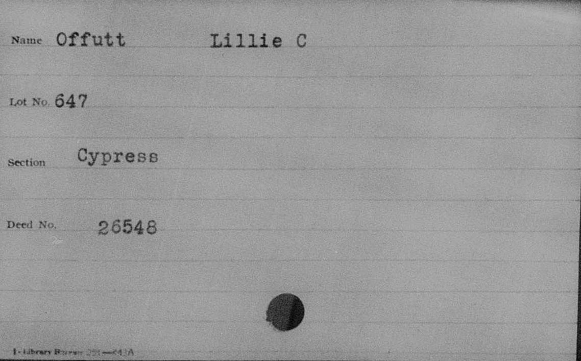 Lot Card for Lillie C. Offutt, Cypress Section, Lot 647, Deed 26548