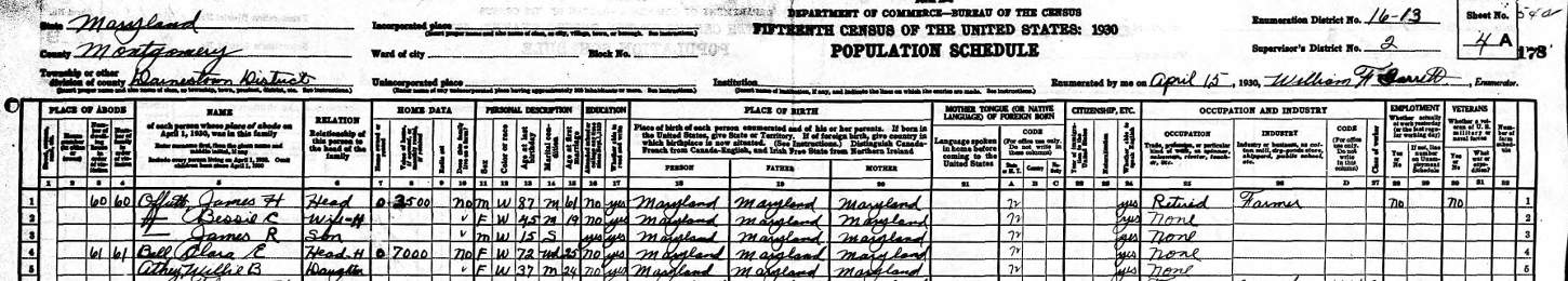 1930 Federal Census; Darnestown District, Montgomery County, MD. Household of James H. Offutt