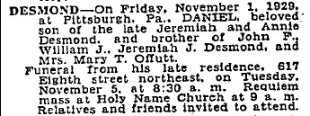 The Washington Post; Page 3; Obituary, clip showing death notice of Dan Desmond