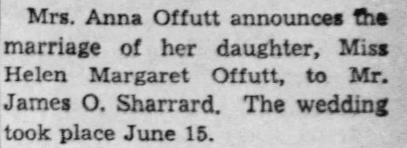 Marriage Announcement for Helen Margaret Offutt and James O. Sharard