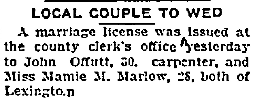 Marriage announcement for John Offutt and Miss Mamie M. Marlow