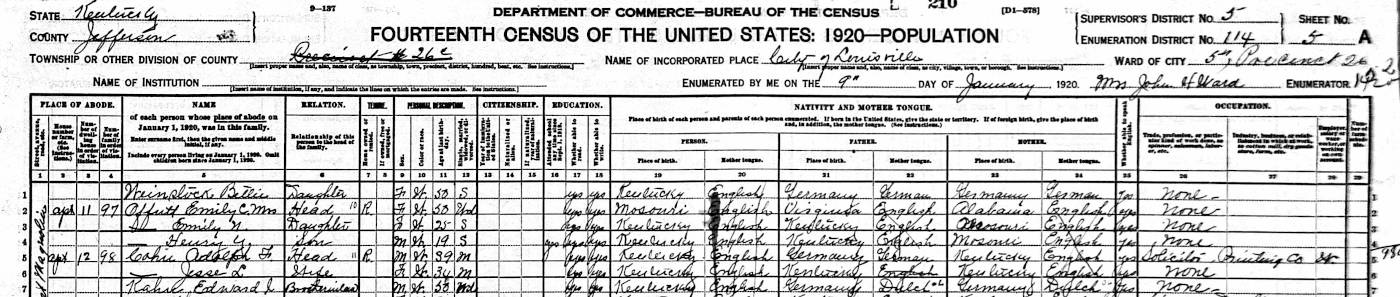 1920 Federal Census for the 5th Ward, Louisville, Jefferson County, KY