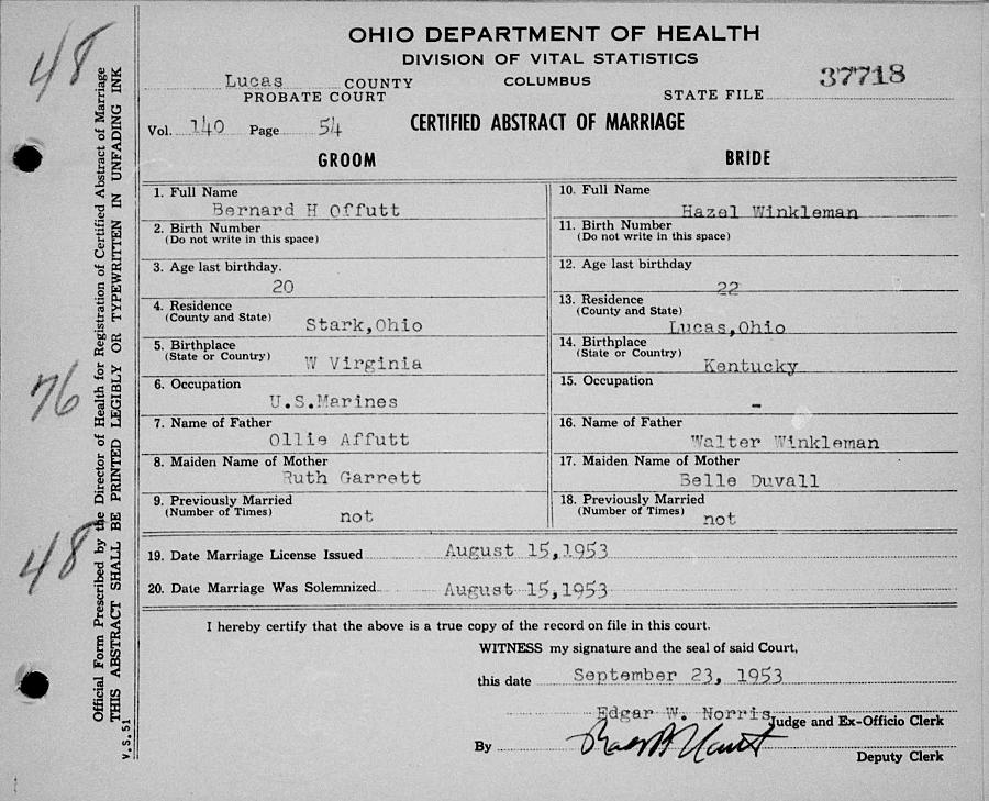 Ohio Department of Health; Certified Abstract of Marriage