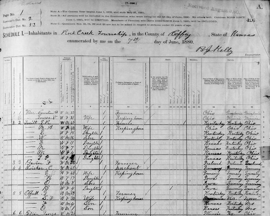 1880 Federal Census for Rock Creek, Coffey County, Kansas