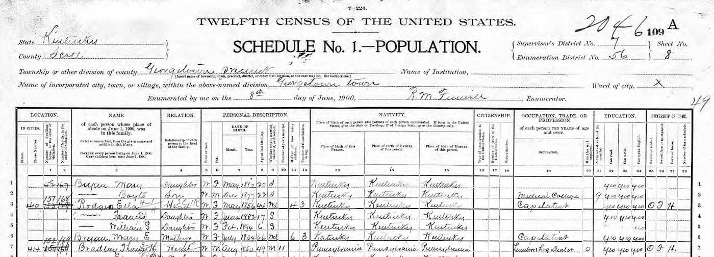 1900 Federal Census; Georgetown, Scott County, KY. Household of Ella Rogers