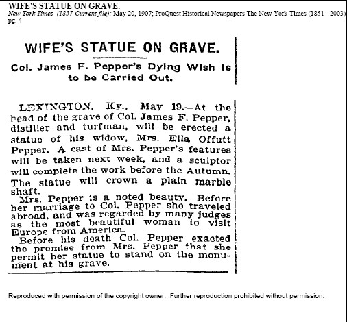 The New York Times dated May 20, 1907; Page 4; Article discussing a statue of Mrs. Ella Offutt Pepper to be erected on her husband's grave