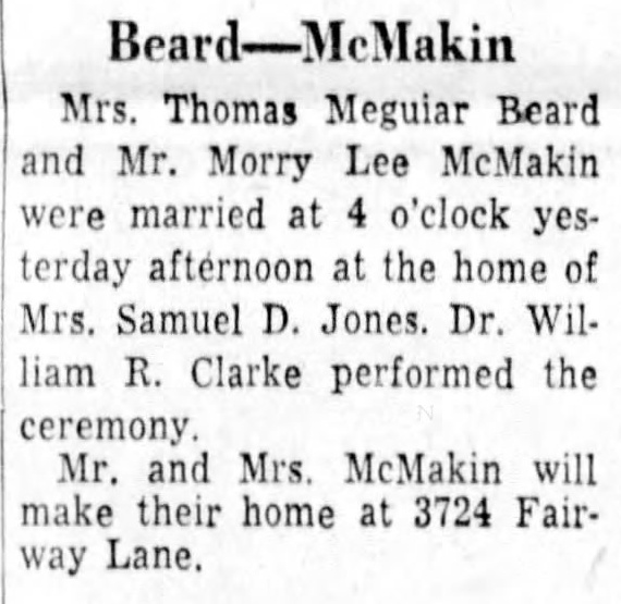 Marriage Announcement for Mrs. Thomas Meguiar Beard and Mr. Morry Lee McMakin