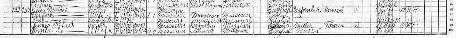 1910 Federal Census; Campbell, Polk County. MO. Household of Kelley McGee. Includes James Offut (As enumarated)