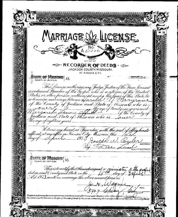 Marriage License for Margaret Lena Offutt and Harold N. Margrave