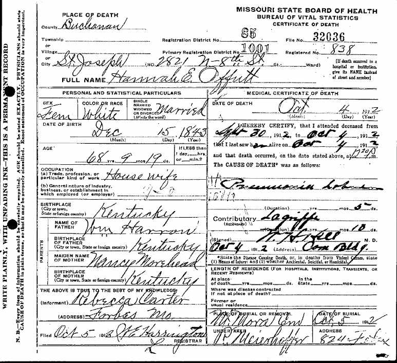 Missouri Certificate of Death for Hannah E. Offutt