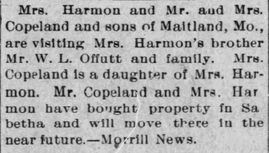 Visit of Mrs. M. A. Harmon and Mr. and Mrs. Copeland to her borther W. L. Offutt