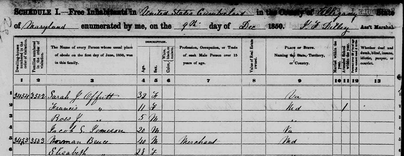1850 Federal Census; Cumberland; Allegany County, MD. Household of J. W. Offutt continued from previous page