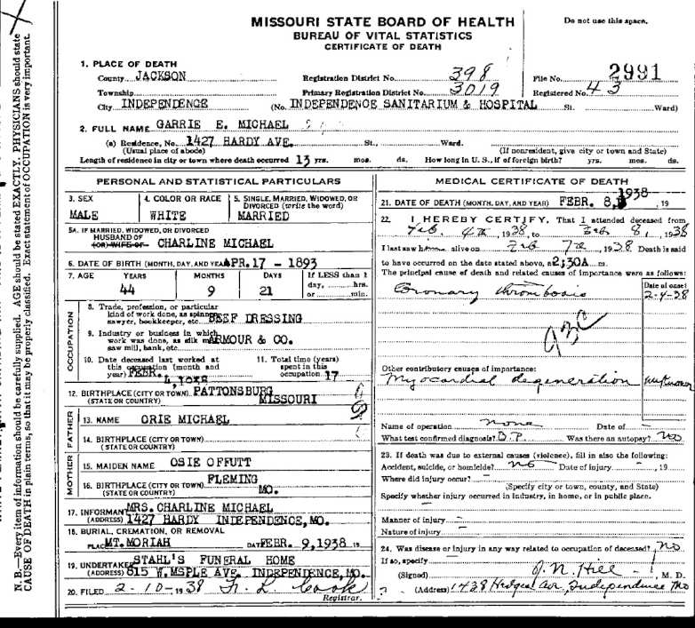 Missouri Certificate of Death for Garrie E. Michael