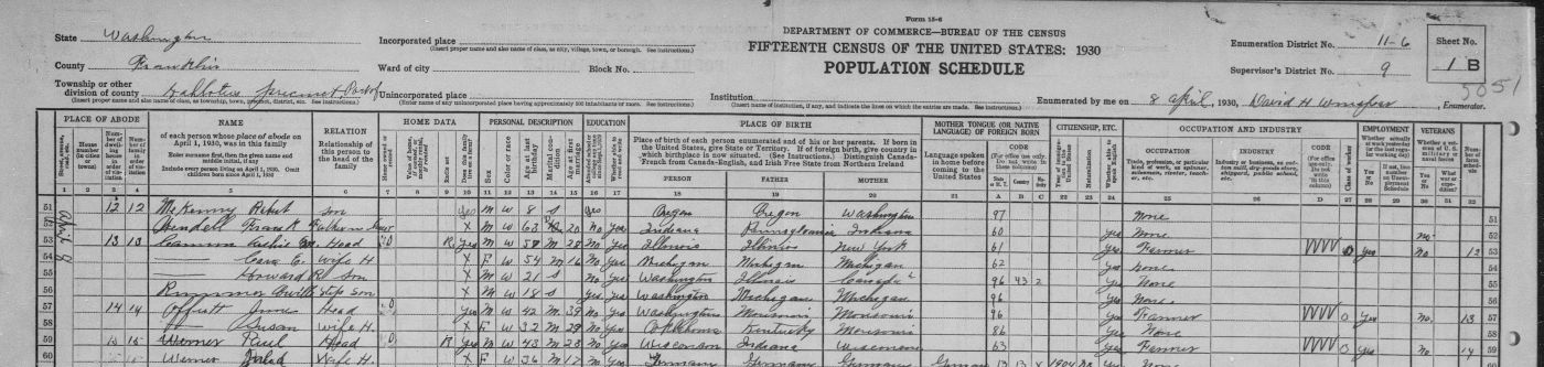 1930 Federal Census of Kahlotus Precinct, Franklin County, WA.