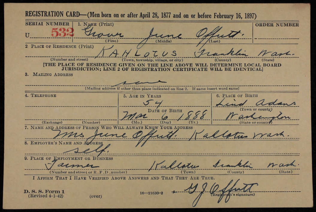 Draft Registration card for Grover June Offutt