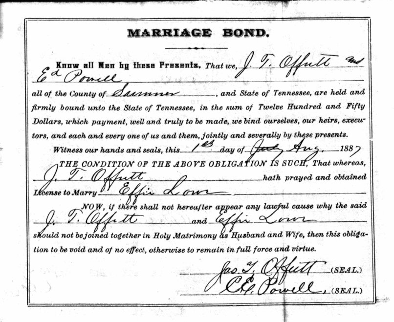 Jas. T. Offutt and Ed Powell provide Bond for the marriage of J. T. Offutt and Effie Lowe