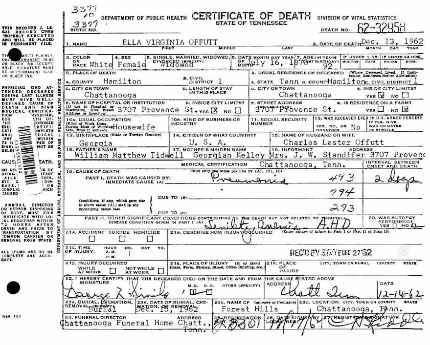 Tennessee Death Certificate for Ella Offutt