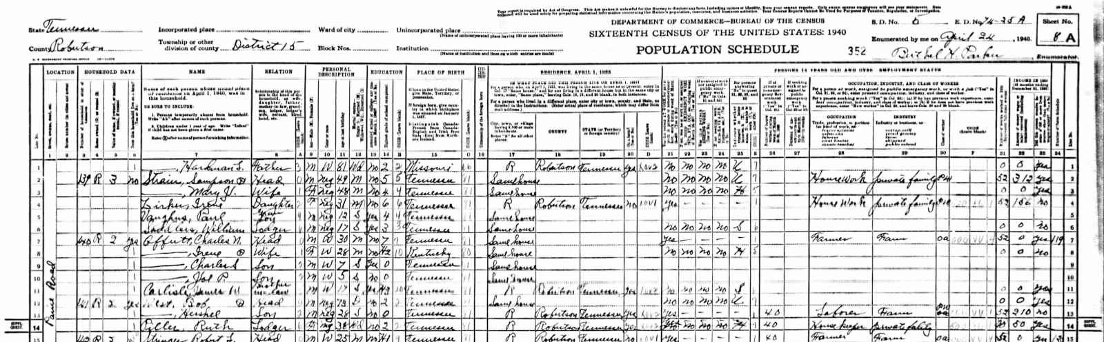 1940 Federal Census; District 15, Robertson County, TN. Household of Charles N. Offutt