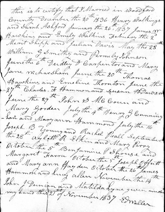 Marriage Certifications submitted by Ed Waller on November 2, 1837 for marriages he performed in Woodford County, KY. Included is the marriage of Joseph Offutt and Mary Ann Hayden on October 5, 1837
