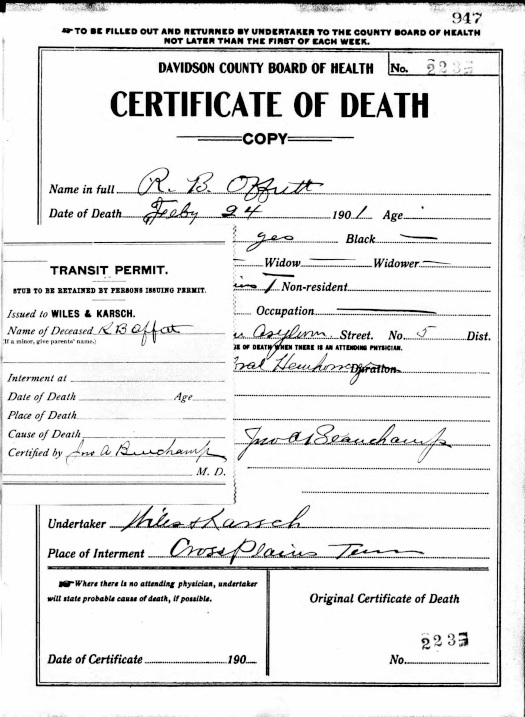 R. B. Offutt; Davidson County (TN) Board of Health; Certificate of Death No. 223(?), left side copy