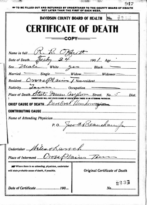R. B. Offutt; Davidson County (TN) Board of Health; Certificate of Death No. 223(?), right side copy