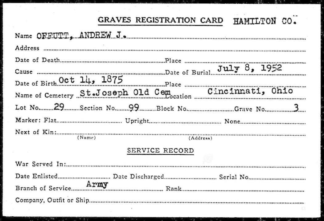 Graves Registration Card, Hamilton County. Name Andrew J. Offutt