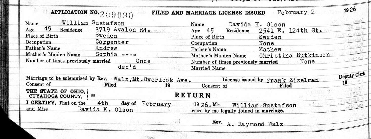 Marriage License Application 209090. Marriage of William Gustafson & Davida K. Olson