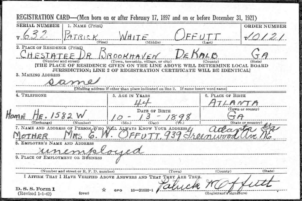 Draft Registration card for Patrick White Offutt