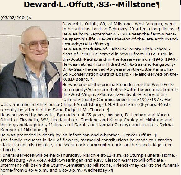 Obituary for Deward L. Offutt; published online March 2, 2004 in "The Hur Herald"