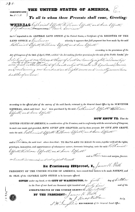 Land grant of 108.97 acres in Louisianna to Nathaniel, William and Ann Offutt dated October 1, 1845, Patent No. 4110
