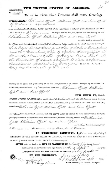 Land grant of 91.91 acres in Louisianna to Nathaniel, William and Ann Offutt dated June 25, 1848, Patent No. 4062