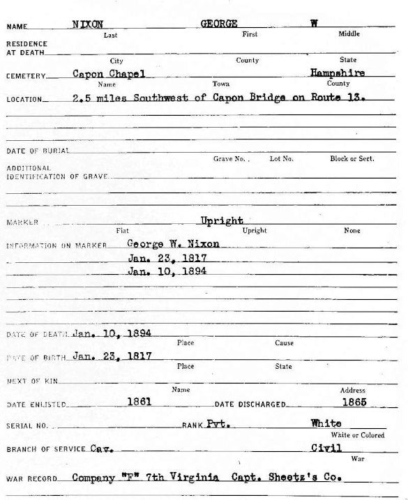 Works Progress Administration veteran burial survey card for George W. Nixon