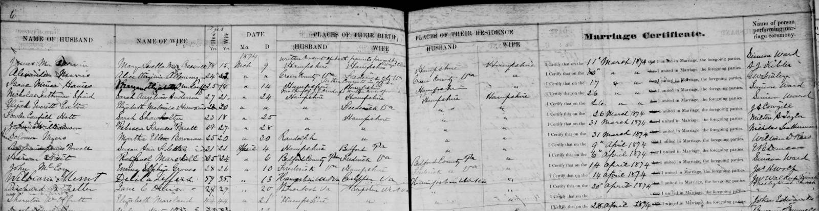 Marriage Register page 6, record for Thornton W. Offutt to Elizabeth Moreland, married April 21, 1874
